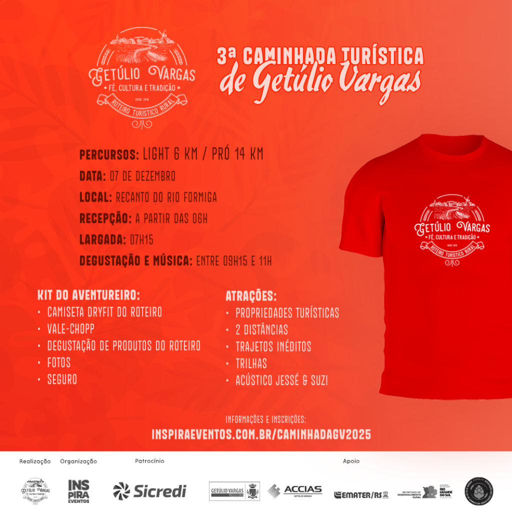 No dia 07 de dezembro de 2025 (domingo) teremos a 3ª Caminhada Turística de Getúlio Vargas/RS. Ela acontecerá no entorno da propriedade Recanto do Rio Formiga, na localidade de Souza Ramos.