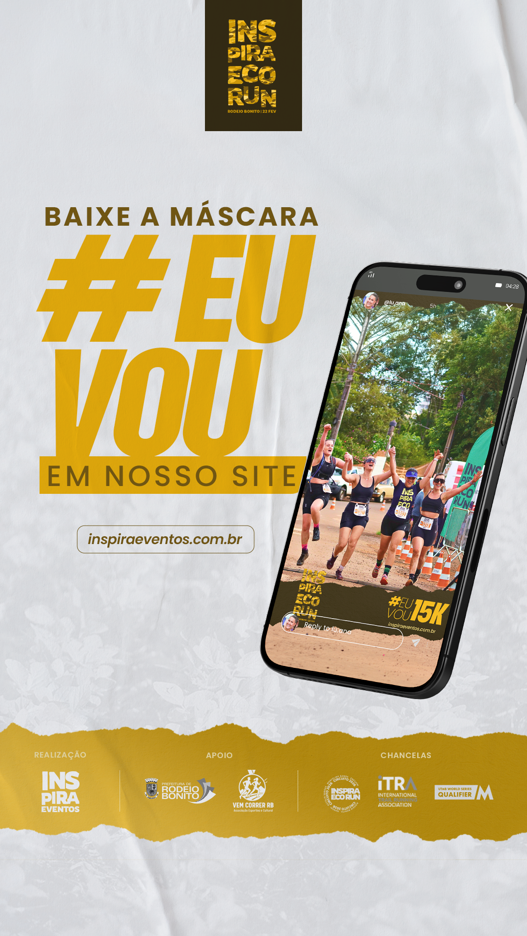 Clique no link abaixo correspondente à distância que se inscreveu, salve na galeria do seu telefone e compartilhe um story com a máscara como uma foto sobreposta.